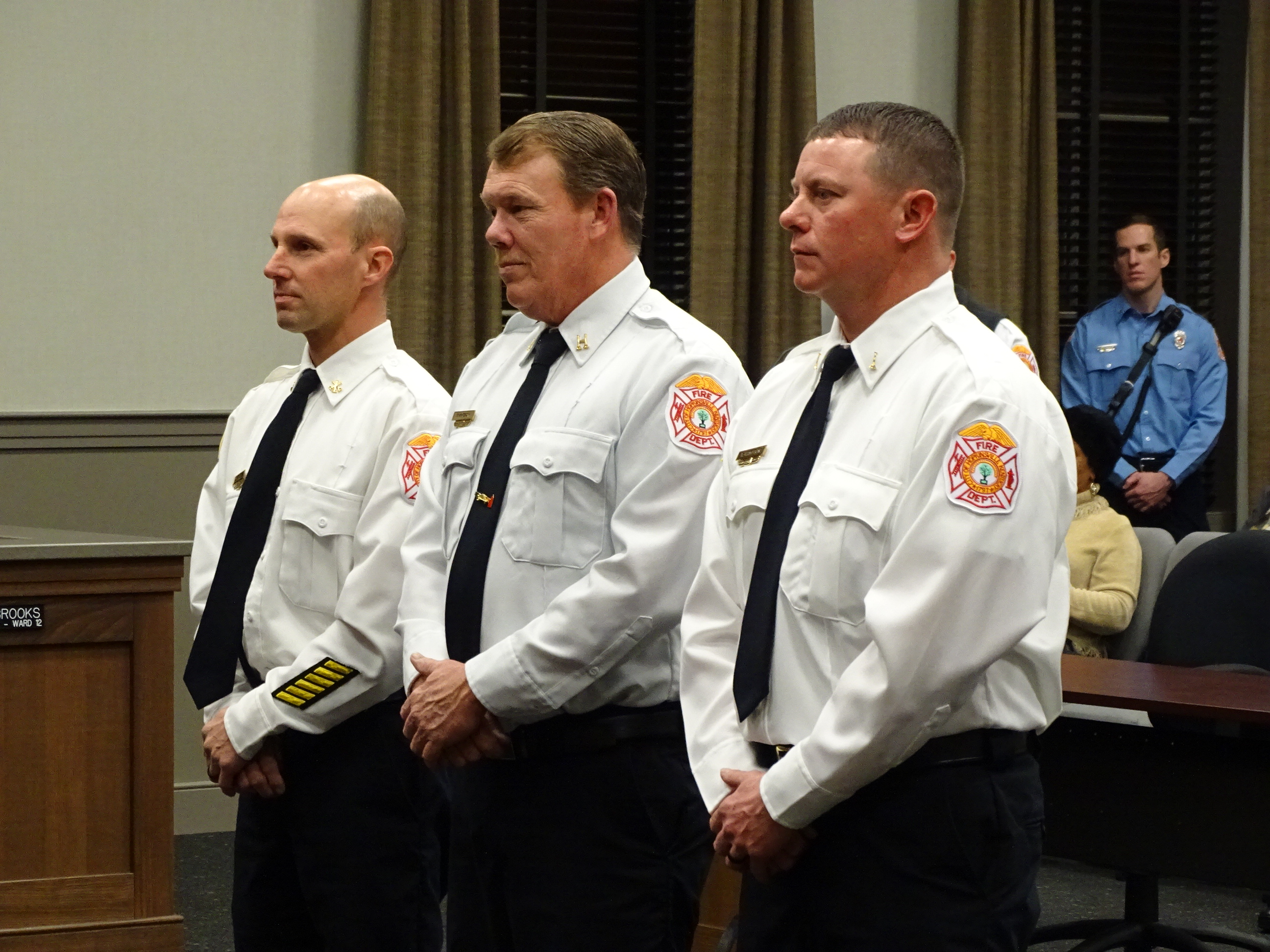 During recognitions, Fire Battalion Chief Spencer Wood, Fire Captain Tommy McGraw, and Fire Lieutenant Todd Hampton were sworn-in by Mayor Hendricks after recent promotions.