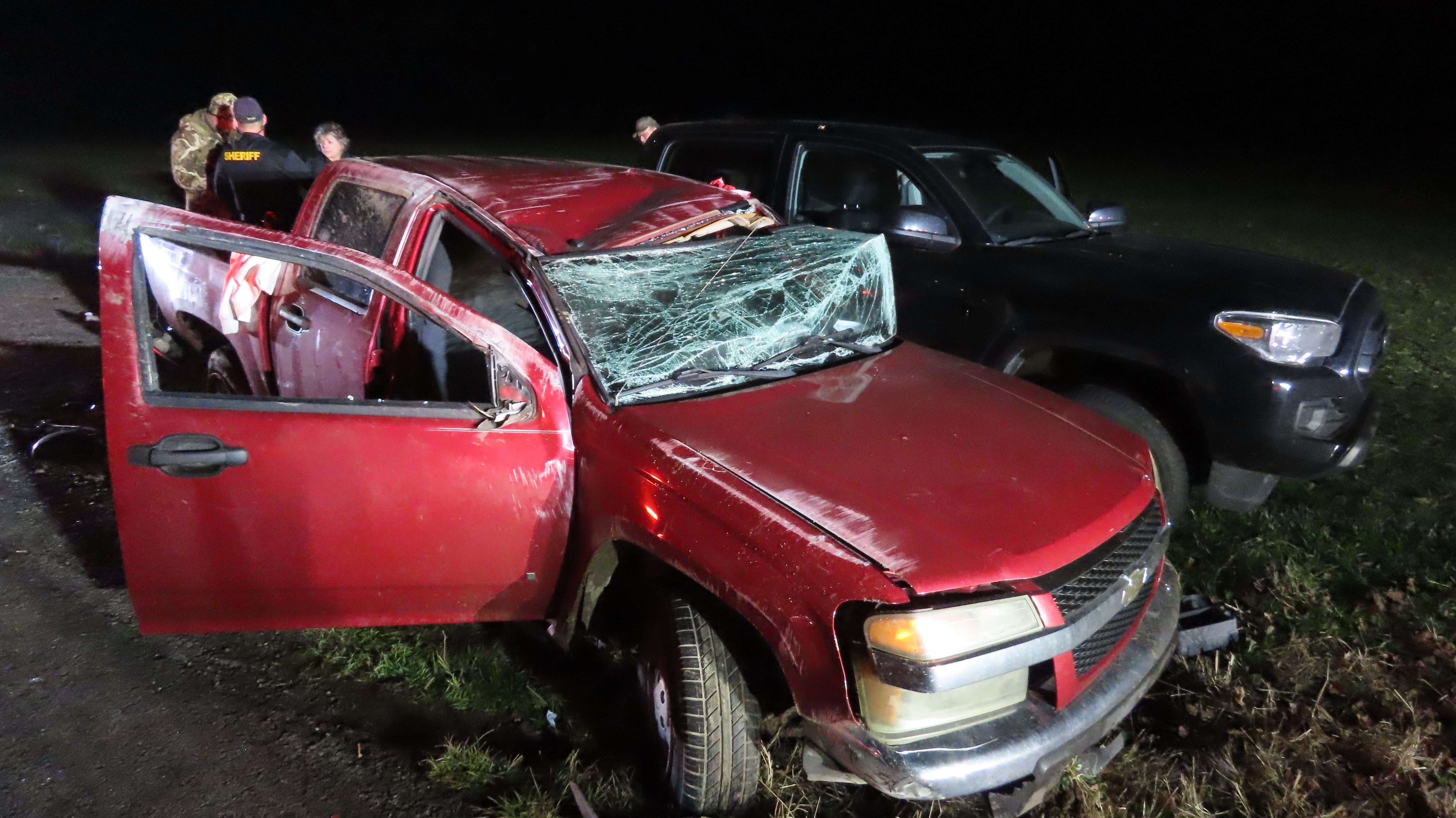 The truck then came back on the roadway and overturned before hitting a parked truck on the opposite side of the road.