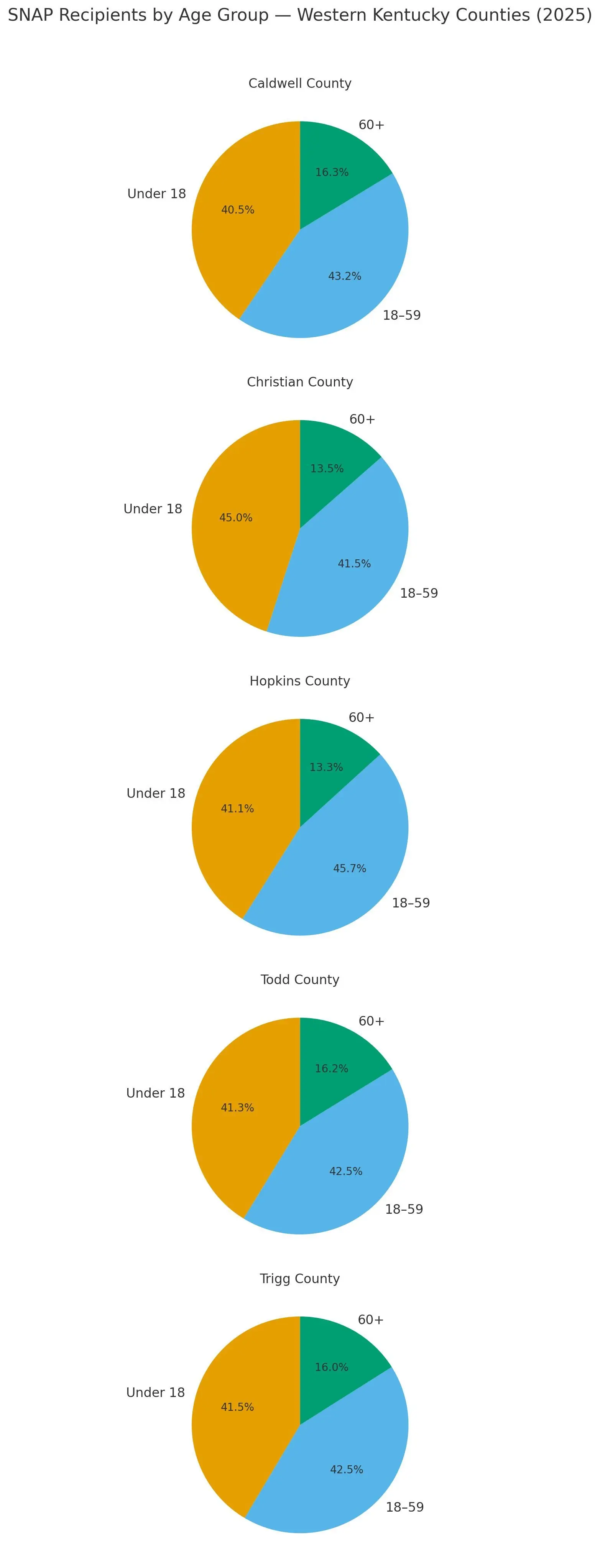 According to the Kentucky Cabinet for Health and Family Services, five local counties — Caldwell, Christian, Hopkins, Todd, and Trigg — have more than 19,500 residents with some level of SNAP assistance.