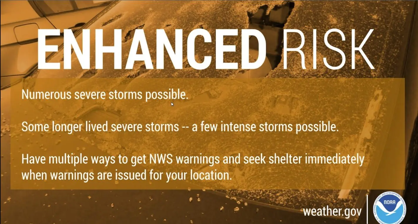 click to download audioHopkinsville and Christian County are on the eastern edge of the enhanced risk area. Todd County and central Muhlenberg County are on the western edge of the slight risk area.
