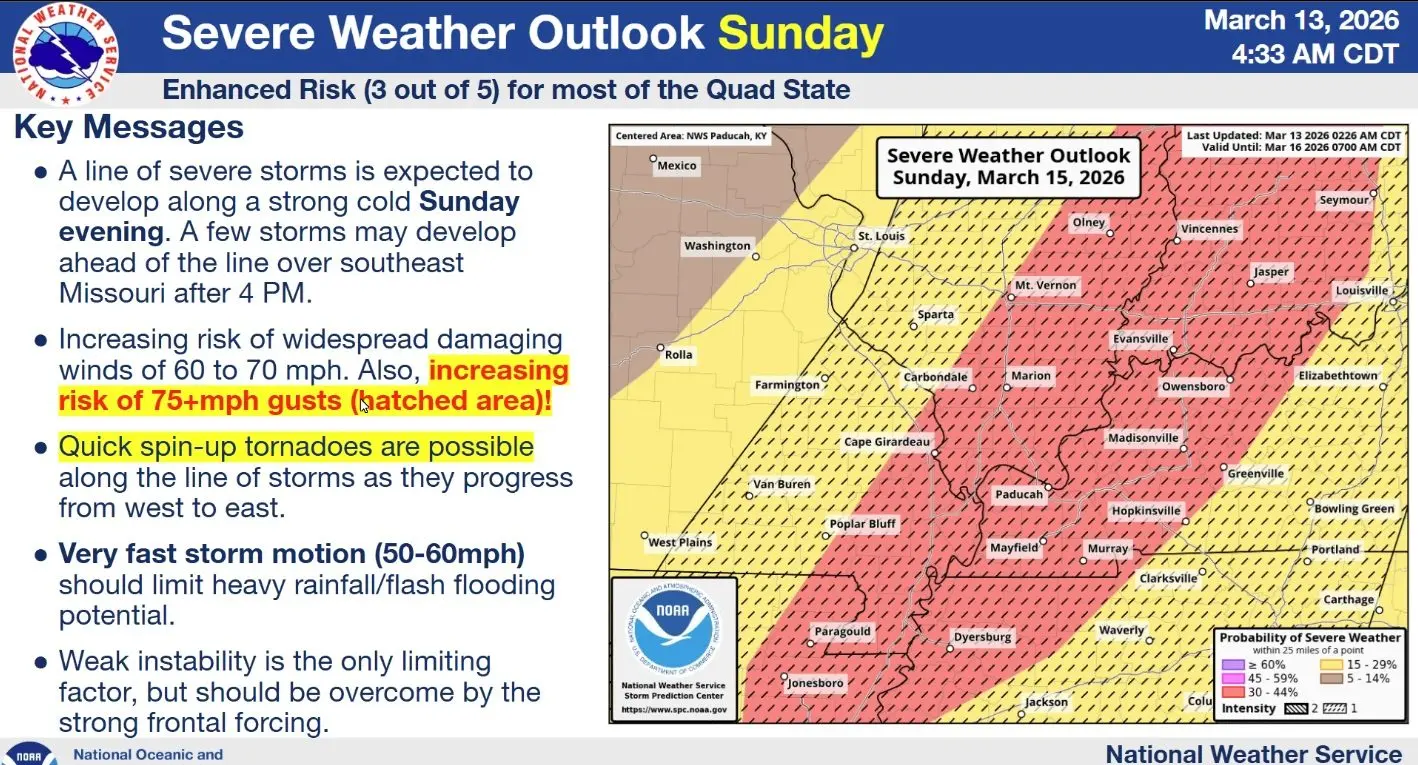 click to download audioAttention is also turning to the potential for severe weather on Sunday afternoon and evening. A line of storms is expected to move through the region, bringing the threat of widespread damaging winds and the possibility of a few brief, spin-up tornadoes. As a result, Spaeth says the area will face an increased risk of severe weather Sunday evening.